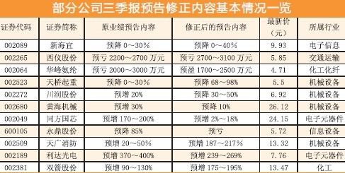 据本报数据中心统计,截至昨日,沪深两市已有新海宜、西仪股份等12家上市公司对此前发布的三季报业绩预告进行了修正,与黯淡的三季报整体预告氛围类似,上述公司所进行的预告修正的结果大多令投资者愁上加愁。