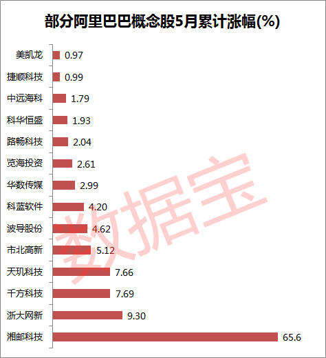从市场表现来看,5月份以来沪指累计下跌5.47%,55只阿里概念股虽然仅有14只个股上涨,但仍有31只个股跑赢沪指,占比过半。湘邮科技以65.6%的涨幅概念股居首,该股近期6个交易日录得5个涨停板。涨幅居次位的是阿里巴巴战略合作伙伴浙大网新,月内累计上涨9.3%;千方科技、天玑科技及市北高新3股月内累计涨幅均超过5%。