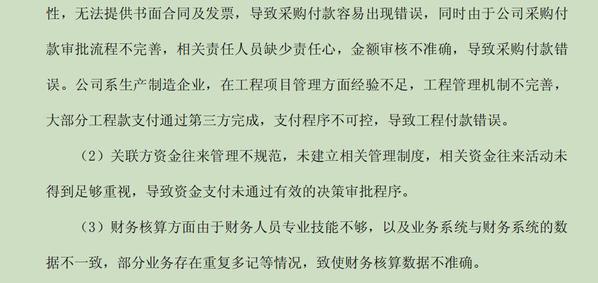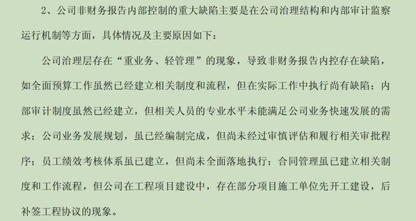 康美药业在回复中表示,公司非财务报告内部控制的重大缺陷主要是在公司治理结构和内部审计监察运行机制等方面,具体情况及主要原因如下:公司治理层存在“重业务、轻管理”的现象,导致非财务报告内控存在缺陷,如全面预算工作虽然已经建立相关制度和流程,但在实际工作中执行尚有缺陷;内部审计制度虽然已经建立,但相关人员的专业水平未能满足公司业务快速发展的需求;公司业务发展规划,虽已经编制完成,但尚未经过审慎评估和履行相关审批程序;员工绩效考核体系虽已建立,但尚未全面落地执行;合同管理虽已建立相关制度和工作流程,但公司在工程项目建设中,存在部分项目施工单位先开工建设,后补签工程协议的现象。