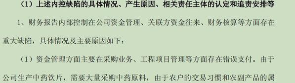 此外,康美药业还承认,公司内部控制、财务管理等方面存在问题,主要有三点:一是公司资金管理、关联交易管理存在缺陷。存在关联方资金往来的情况,违反了公司日常资金管理规范及关联交易管理制度的相关规定;二是公司财务核算存在缺陷,未能反映公司实际财务状况,导致前期会计差错更正;三是公司治理层及内部审计部门对内部控制的监督不到位,使得公司监督系统在日常监督工作中没有发现上述缺陷,并按要求及时汇报和纠正。