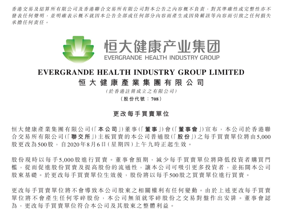 恒大健康(0708.HK)发布公告,自8月6日起,每手买卖单位将由5000股降至500股。以最新收盘价23.75港元计算,投资者买入一手恒大健康股票将从原来的118750港元大幅降至11875港元。此举将大大降低公司的投资门槛,提高股份流动性,让更多中小投资者分享恒大健康高速发展的红利。