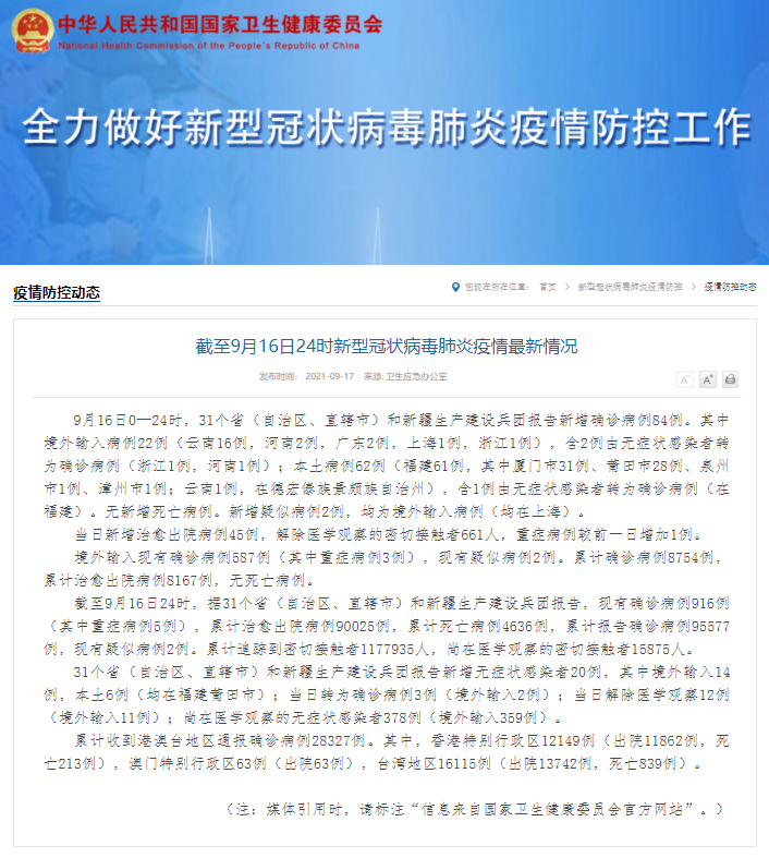 9月16日0—24时,31个省(自治区、直辖市)和新疆生产建设兵团报告新增确诊病例84例。其中境外输入病例22例(云南16例,河南2例,广东2例,上海1例,浙江1例),含2例由无症状感染者转为确诊病例(浙江1例,河南1例);本土病例62例(福建61例,其中厦门市31例、莆田市28例、泉州市1例、漳州市1例;云南1例,在德宏傣族景颇族自治州),含1例由无症状感染者转为确诊病例(在福建)。无新增死亡病例。新增疑似病例2例,均为境外输入病例(均在上海)。