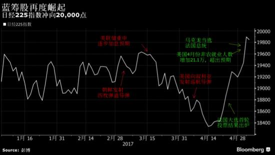 日经225指数已从4月14日触及的低点反弹了8.6%,涨幅在彭博追踪的96支主要股票指数中名列前茅。在这波全线上涨行情中,所有的板块都已走高,取得这一成绩的背景环境是:朝鲜紧张局势得到缓和、就业数据提振了对美国经济的信心,以及马克龙赢得法国总统选举。