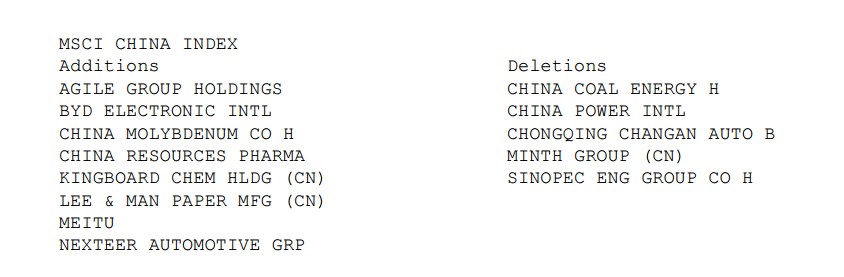 新纳入公司包括雅居乐、比亚迪电子、洛阳钼业H股、华润医药、建滔化工、理文造纸、美图公司、耐世特。5只被调出指数的股票分别是敏实集团、中煤能源、中国电力、中石化炼化和长安B。