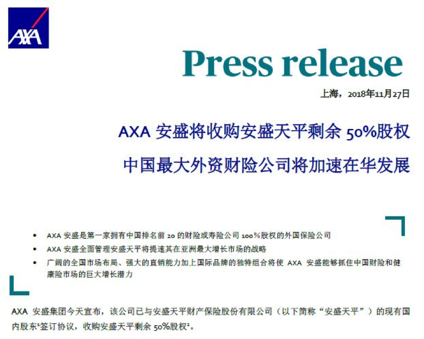 11月27日,安盛集团(AXA)发布消息称,法国安盛保险股份公司(下称“安盛保险”)已与包括天茂集团在内的安盛天平财产保险股份有限公司(下称“安盛天平”)5家中方股东签订协议,拟收购剩余50%的股权。自此,安盛集团将成为首家拥有中国排名前20财险公司100%股权的外资保险公司。