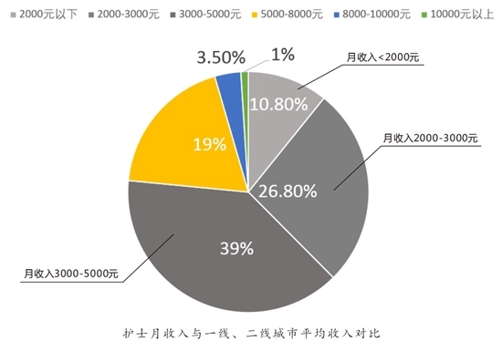 调查显示,护士的整体收入水平不尽如人意。根据《中国护士群体发展现状调查白皮书》,截至2015年底,全国注册护士总数为324万人,收入待遇严重偏低。其中76.5%的护士月收入低于5000元,整体收入水平低于城市平均收入。在已离职护士中,48.8%的护士离职原因是收入低。