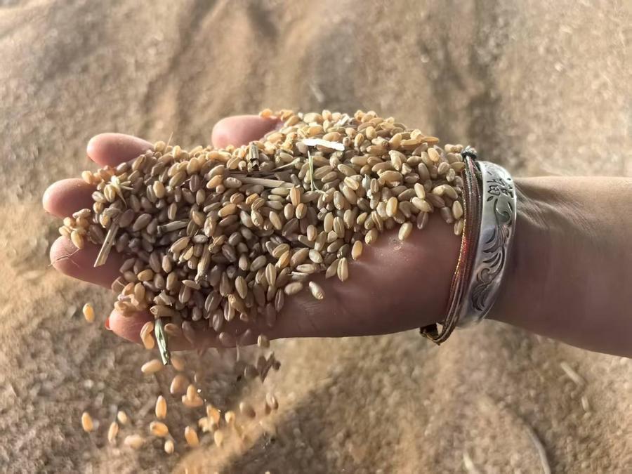 图为河南省西平县师灵镇白庙村,诚信种植专业合作社负责人康明丽展示粮仓中刚刚收获的小麦。新华社记者 马意翀 摄