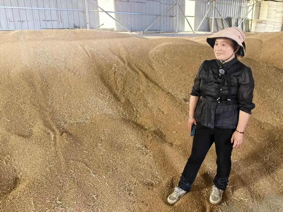 图为河南省西平县师灵镇白庙村,诚信种植专业合作社负责人康明丽站在粮仓门口,看着刚刚收获完成、堆积如山的小麦,脸上漾起欣慰的笑容。新华社记者 马意翀 摄