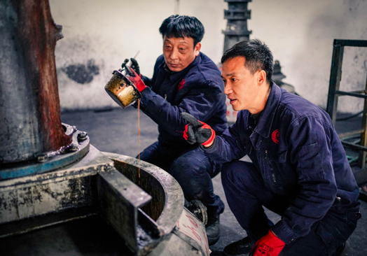 第三代传承人张永林和第四代传承人魏光耀在讨论制墨煮胶的细节