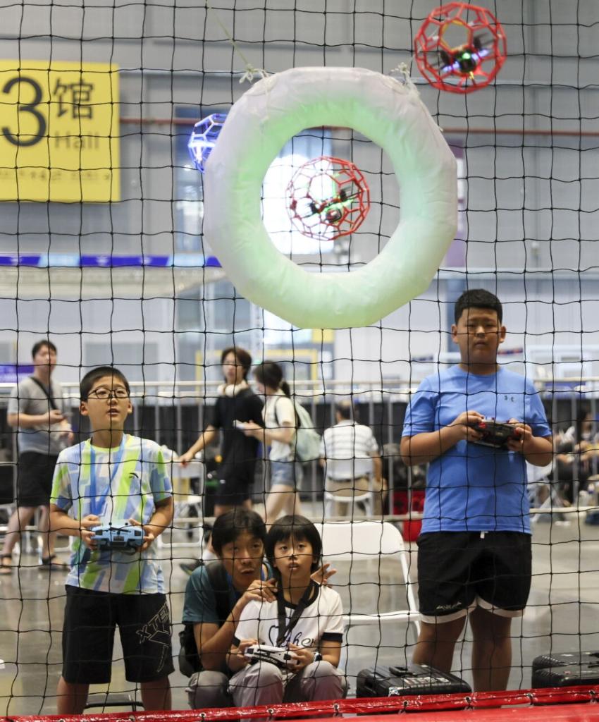 进入比赛现场,仿佛进入了魔法世界。记者看到,运动员在地面通过遥控器精准操纵无人机在空中飞行,进行攻防对抗,射进“圆形球门”即得分。