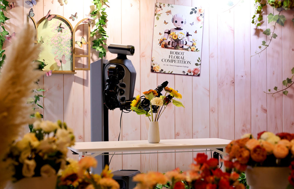 在应急救援赛区的对面,具身智能被包围在鲜花丛中,有11支赛队一较高下。第三届全国职业技能大赛人工智能赛道上海队教练张晔说,这考验的是对“力”的掌控,因为花茎的脆度、花瓣的张力,都在毫厘之间。