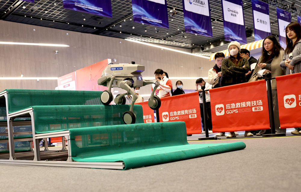 在应急救援赛区,四足机器人要经过爬楼梯、碎砖地、爬坡等多个障碍点,比完成度、比时间,考验实时判断与决策能力。