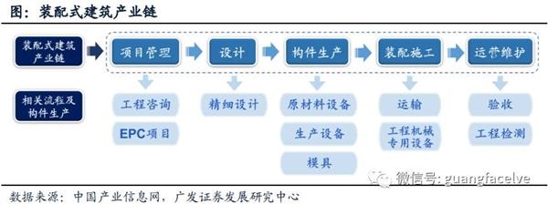 装配式建筑产业链包括项目管理、设计、构件生产、装配施工和运营维护五大环节,包括房地产企业、预制构件加工企业和项目施工企业等三大主体。产业链重点环节分布于预制构件的生产环节和装配环节,其中,装配环节主要涉及工程机械等专用设备,以替代性需求为主,对现有行业格局影响相对较小;而预制构件生产环节行业基础薄弱,生产线处于起步发展阶段,原材料设备(如套筒灌浆料、套筒、门窗等)、生产设备(如生产线等)、工程检测设备(如红外线检测、超声波检测等)等相关预制构件生产线有望受益于装配式建筑渗透率提升.
