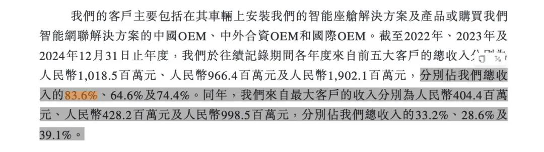 2022年、2023年、2024年,其来自前五大客户收入占总收入比例为83.6%、64.6%及74.4%。其中,同期来自最大一家客户的收入占总收入的比例为33.2%、28.6%及39.1%。