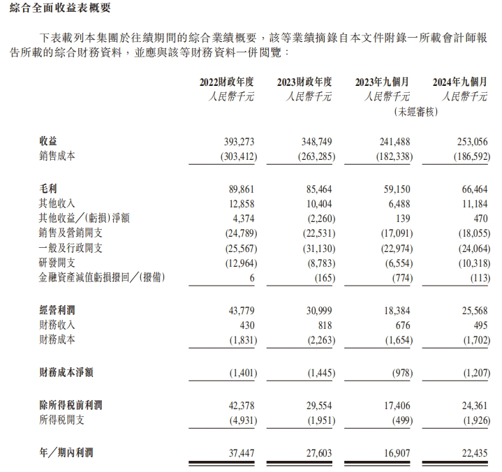 2022年、2023年和2024年前9个月,公司毛利分别为0.899亿元、0.855亿元和0.665亿元,利润分别为0.374亿元、0.276亿元和0.224亿元。