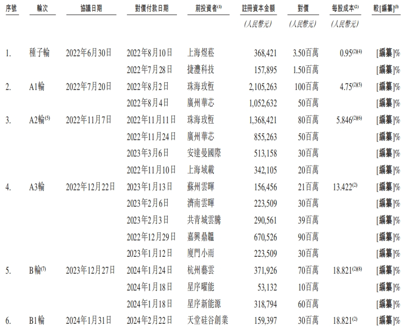 招股书显示,思格新能源先后完成6轮融资,包括2022年6月的500万元种子轮融资;2022年7月至12月进行的A1至A3轮融资,累计融资5.4亿元。2023年12月,思格新能源进行了1.4亿元B轮融资,2024年1月进行了3000万元B1轮融资。