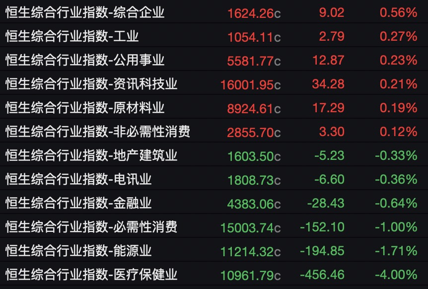 行业板块方面,港股市场行业板块涨跌不一。其中,综合企业、工业、公用事业等上涨,分别上涨0.56%、0.27%、0.23%。而医疗保健业、能源业、必需性消费业跌幅居前,分别下跌4.00%、1.71%、1.00%。