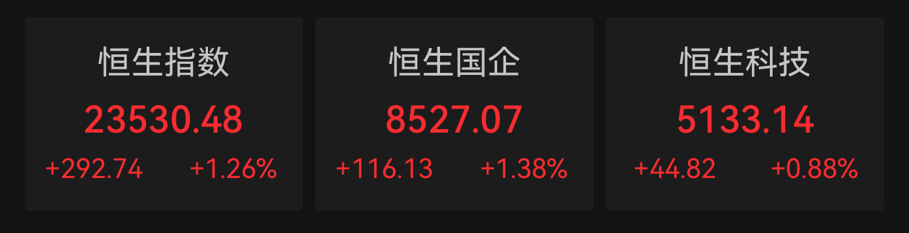 Wind数据显示,截至收盘,恒生指数涨1.26%,报23530.48点;恒生中国企业指数涨1.38%,报8527.07点;恒生科技指数涨0.88%,报5133.14点。