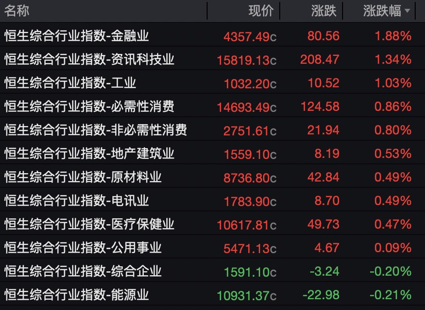 Wind数据显示,恒生12个综合行业指数中有10个上涨。其中,金融业、资讯科技业、工业指数涨幅居前,分别涨1.88%、1.34%、1.03%。能源业、综合企业表现不佳,分别下跌0.21%、0.20%。