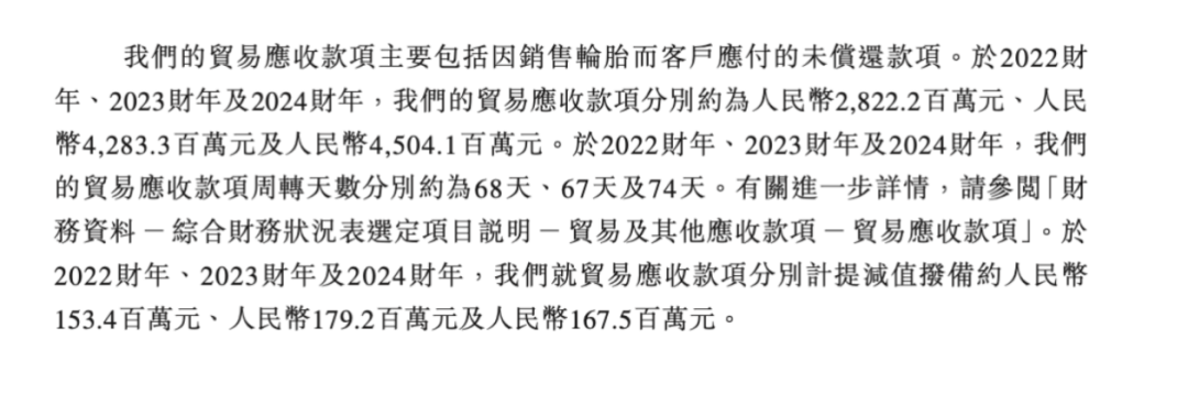随着收入增长,公司贸易应收款项余额也在增长。招股书显示,截至2022年末、2023年末及2024年末,玲珑轮胎的贸易应收款项分别为28.22亿元、42.83亿元及45.04亿元。玲珑轮胎的贸易应收款项主要包括因销售轮胎而客户应付的未偿还款项。
