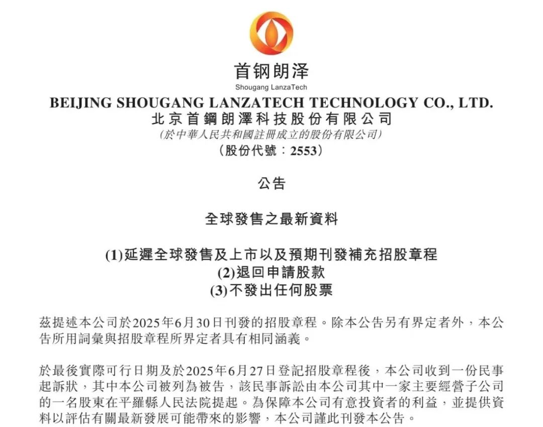 首钢朗泽7月2日晚间公告,在登记招股章程后,公司于6月27日收到一份民事起诉状,公司被列为被告,该民事诉讼由公司一家子公司的一名股东在平罗县人民法院提起。鉴于上述民事诉讼,公司将延迟全球发售及上市。