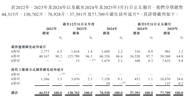 根据招股书,2022年、2023年、2024年及2025年前5个月,天域半导体分别销售4.45万片、13.07万片、7.89万片及7.77万片碳化硅外延片。