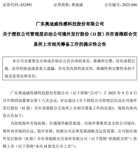 奥迪威,筹划H股上市