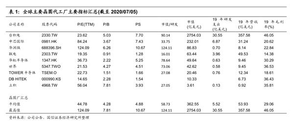 该行在报告中给出了一组行业估值数据(截至7月5日):按PE来看,全球主要晶圆厂PE(TTM)平均值为44.78倍,最高值为124.09倍。PB来看,全球主要晶圆厂PB(MRQ)平均值为4.28倍,最高值为7.81倍。PS来看,PS平均值为4.88倍,最高10.67倍。