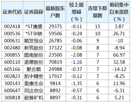 股东户数连续下降个股中,连降时间较长的有*ST康盛、*ST华映等。其中,*ST康盛股东户数已连续减少15期,累计降幅为27.47%;*ST华映股东户数连降10期,累计降幅16.34%。从最新一期的股东户数下降幅度看,降幅较大的有再升科技、图南股份、盈康生命等。