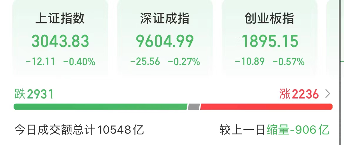 截至收盘,上证指数下跌0.4%,深证成指下跌0.27%,创业板指下跌0.57%。