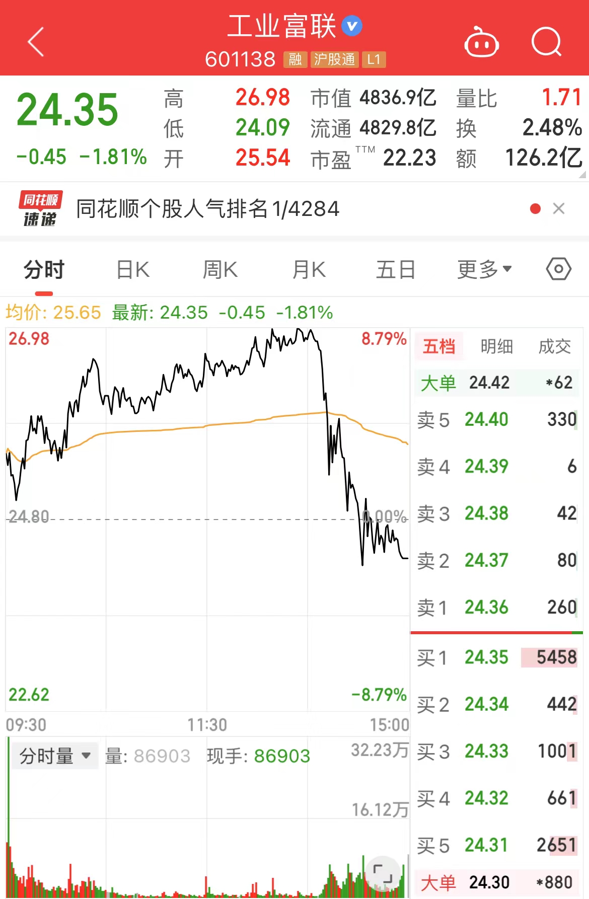工业富联下跌1.81%,盘中最高涨近9%,最新市值为4837亿元。数据显示,工业富联将于今天盘后披露2023年年报,盘中有传言称,其业绩不及预期。