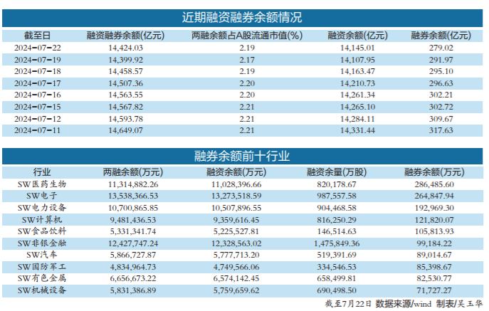 从行业融券余额情况来看,Wind数据显示,截至7月22日,申万一级行业中,医药生物、电子、电力设备行业融券余额规模居前,分别为28.65亿元、26.48亿元、19.30亿元。此外,计算机、食品饮料行业融券余额超10亿元。