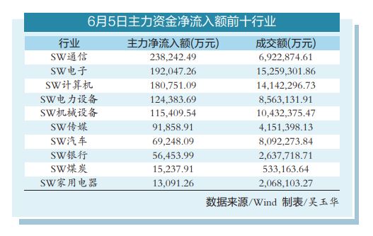 Wind数据显示,6月5日沪深两市主力资金净流出3.59亿元,较前一个交易日小幅增加,其中沪深300主力资金净流入24.19亿元。沪深两市出现主力资金净流入的股票数为2443只,出现主力资金净流出的股票数为2680只。