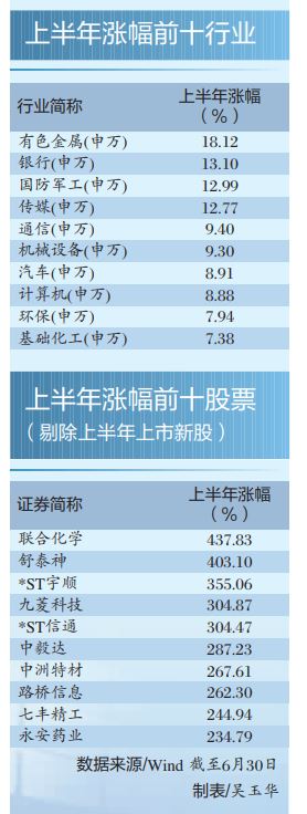 上半年A股收官,市场震荡上涨,总市值站上100万亿元,创历史新高。上半年,上证指数累计涨逾2%,北证50指数累计涨近40%,结构性行情明显。有色金属、银行、国防军工、传媒行业领涨,均涨逾12%,涨幅最大的股票是联合化学,上半年涨超430%。