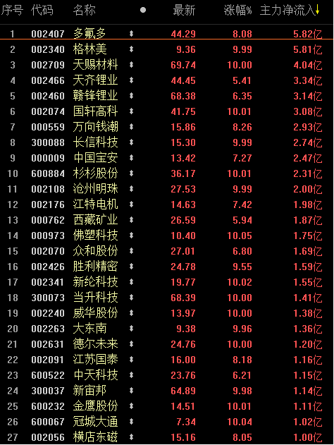 据东方财富Choice数据统计,从资金流向上看,今日锂电池板块有26只个股主力净流入超亿元,主力资金累计净流入60.05亿元,主力抢筹可谓疯狂。多氟多、格林美主力净流入超5亿元,天赐材料主力净流入超4亿远,天齐锂业、赣锋锂业、国轩高科主力净流入超3亿元。