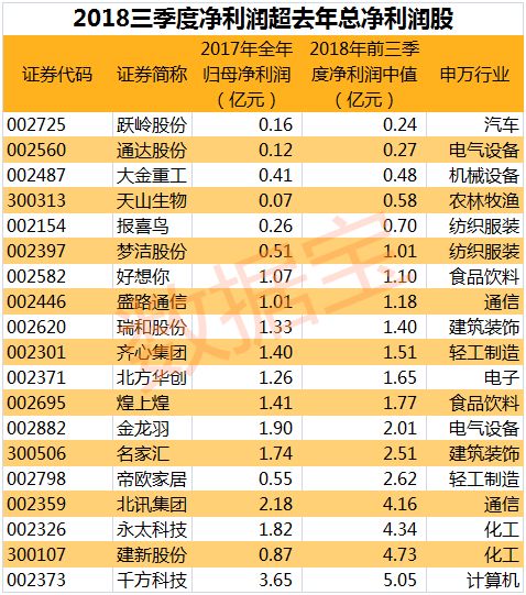 最新披露中报公司中有112家发布三季度业绩预告,其中有101家2017年为盈利状态(2017年全年净利润为正)。将2018年三季度预告净利润中值与2017年净利润对比发现,19股三季度净利润有望超过去年全年盈利目标,纺织服装、化工及建筑装饰股居多。