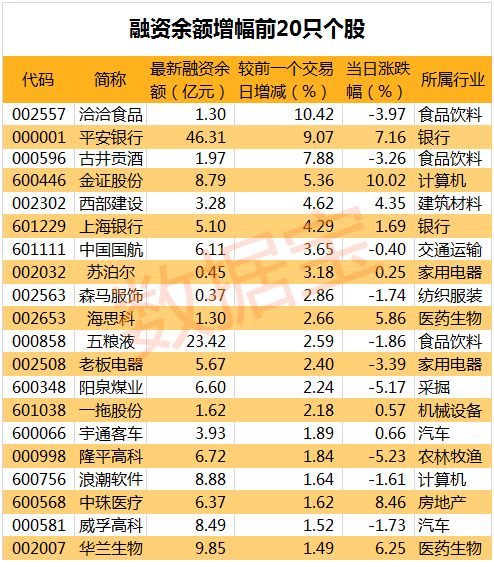 融资余额增幅前20只个股中,市场表现来看,平均上涨0.84%,涨幅居前的有金证股份、中珠医疗、平安银行,涨幅分别为10.02%、8.46%、7.16%。跌幅居前的有隆平高科、阳泉煤业、洽洽食品,跌幅分别为5.23%、5.17%、3.97%。