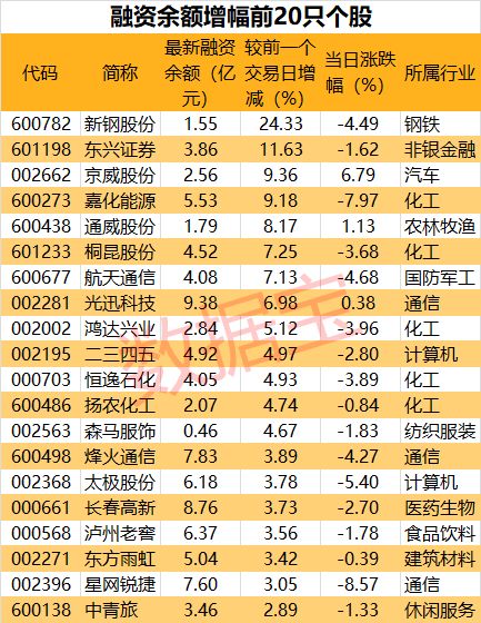 具体到个股来看,融资余额出现增长的标的股有360只,占比37.93%,其中,9股融资余额增幅超过5% 。融资余额增幅最大的是新钢股份,该股最新融资余额1.55亿元,较前一交易日增幅达24.33%;股价表现上,该股当日下跌4.49%,表现弱于沪指;融资余额增幅较多的还有东兴证券、京威股份,融资余额增幅分别为11.63%、9.36%。