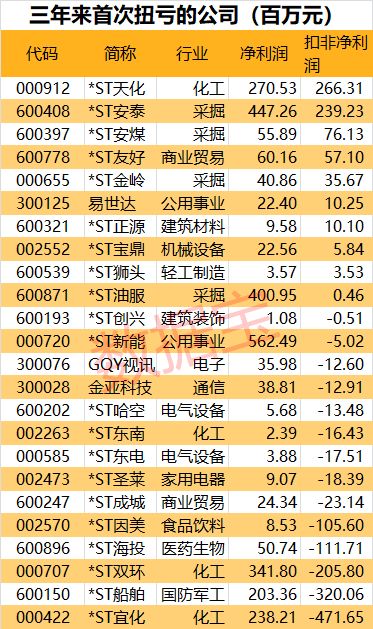 2018年上半年共有24家公司实现了三年来业绩的首次扭亏,除金亚科技、GQY实训和易世达外,其余均为ST股,本期归属于母公司净利润排名前五的个股依次是*ST新能、*ST安泰、*ST油服、*ST双环和*ST天化。
