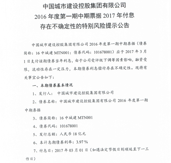 新浪财经讯 2月22日消息,中城建披露称,2016年度第一期中期票据2017年付息存在不确定性。