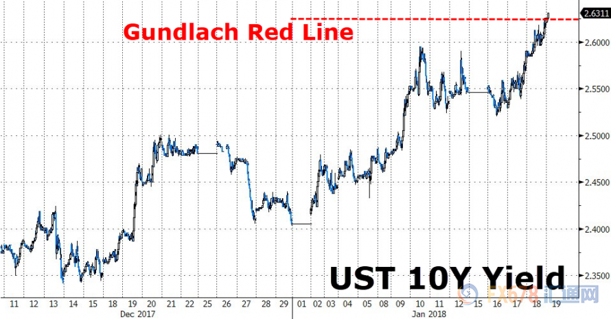 美国10年期国债收益率突破2.63%的关键水平,是2016年12月以来的最高点,突破了新债王冈拉克(Jeffrey Gundlach)的“红线”。