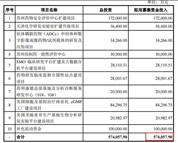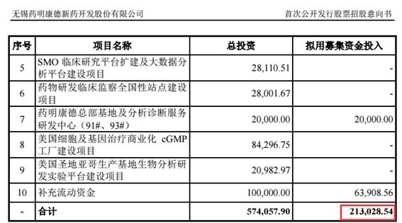 值得注意的是,药明康德最新的拟募资金额为21.3亿元;此前披露的招股意向书申报稿显示,公司拟募资金额为57.4亿元,缩水幅度高达63%。