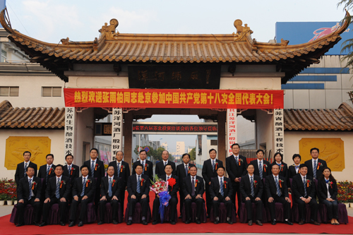11月2日下午,古镇洋河一派节日的喜庆氛围:飘动的气球,飞跨的拱门,鲜红的横幅,醒目的标语。党的十八大代表,江苏洋河酒厂股份有限公司董事长、总裁张雨柏,在江苏洋河酒厂股份有限公司党委书记杨廷栋、洋河新城管委会主任刘金山、江苏洋河酒厂股份有限公司执行总裁钟玉叶等领导的陪同下,满面笑容地来到酒厂大门前,与在厂江苏洋河酒厂股份有限公司领导班子成员一起合影留念。