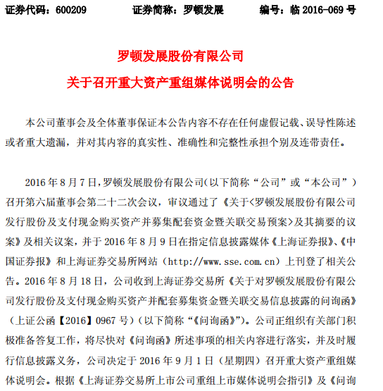 罗顿发展9月1日14:00-16:00召开重组媒体说明会