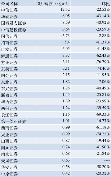 有数据可比的25家券商(除去天风证券)10月合计实现营收79.73亿元,环比降幅达39%。