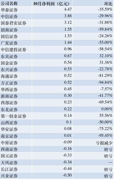 此外,海通证券、华安证券、西部证券、招商证券、中信建投、广发证券和山西证券10月净利润环比降幅均超过50%。
