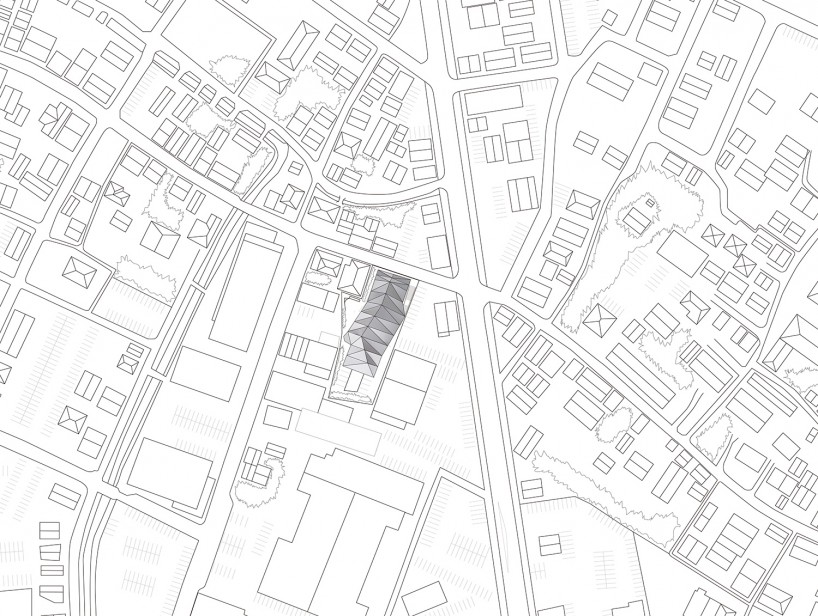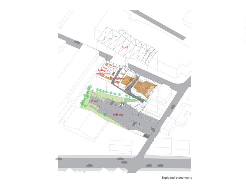 为了给教区居民提供停放汽车的空间,整个结构都被提升,在地面上形成了一座大楼的庇护停车场。除了参考该地区的山区形式之外,教堂的锯齿状屋顶线还确保自然光线到达该计划的每一个区域。每五米开放一次使得间接的日光照亮教堂的中殿,减少人造照明的需要。