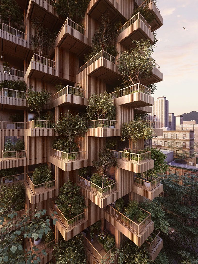 该项目的关键要素之一是建筑中发现的木材和木材技术的创新使用。该住宅不仅使用大块木板作为其主要结构元件,而且还将木材覆盖板作为其外墙。大门外区为居民提供了草本植物和蔬菜种植园的空间。露台上的植物学为每个公寓提供一个私人花园,在城市密度范围内创造一定程度的隐私。“在某种程度上,我们正在增加延伸塔楼的材料。“这种联系有助于进一步发展真正的生态高层,为居民提供更新鲜的空气,并创造更低的碳足迹。”tmber首席执行官Mark Stein说