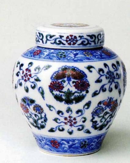 图5 明成化斗彩团花菊蝶纹盖罐及底书青花“大明成化年制”六字双行楷书款,外围青花双图