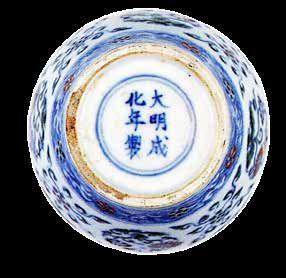虽然两件器物造型纹饰相同,但嘉靖器底仍书本朝年款,只是形式上仿成化为六字四方双栏款。在成化之前从永乐时期开始,器物上开始盛行书本朝帝王年款,除永乐朝多为四字篆书款外,一般都以六字双圈楷书款为主,少数以横款形式出现,其后弘治、正德乃至明代晚期及清代各朝器物的款识,也都是六字双圈款居多。但是成化斗彩器一改前朝风格,多书六字双行方栏款,非常有特色。关于成化官窑款识特征,鉴定专家曾归纳成为6字歌诀:“大字尖圆头非高,成字硬撇直到腰,化字‘人’‘匕’平微头,制字衣横少越刀,明日窄平年肥胖,成字三点头肩腰。”在题款书写风格上,成化款多用藏锋笔法,少有极细的笔锋,笔道粗、字体肥,在放大镜下观察青花色泽,似有一层或浓或淡的雾朦,字色微微下沉。总体来说其字体虽沉稳,但在书写上却略显稚拙,不似其他朝代规整遒劲。有专家考证,成化年款在成化四年就已经定型和开始使用了,当时成化帝年仅22岁,这种稚拙的笔锋很可能出自少年皇帝之手,因为传世成化皇帝所题一首画诗中的字体,与成化斗彩上的款识有许多相似风格,如果这种观点成立,说明成化皇帝与成化斗彩之间有非同寻常的关系。